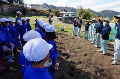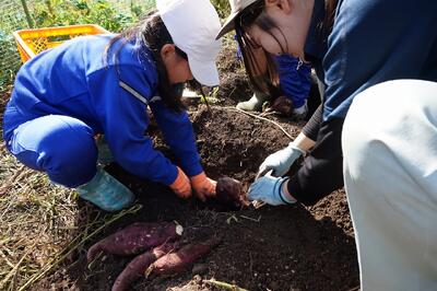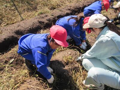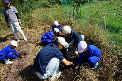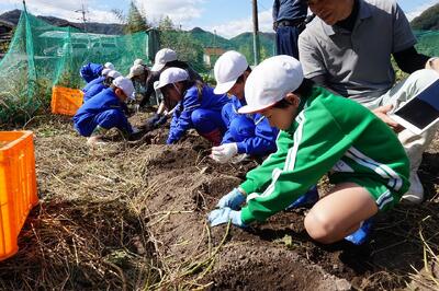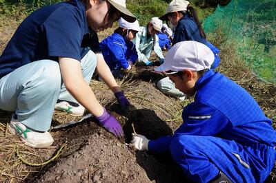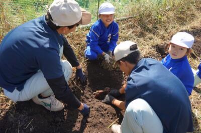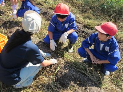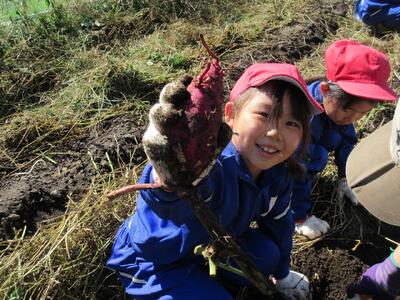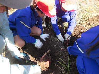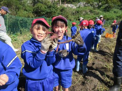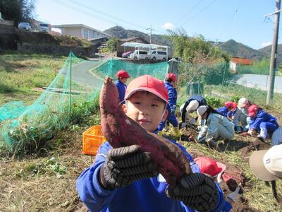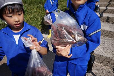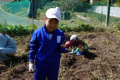 2年生がいもほりをしました。春に植えた苗に大きなサツマイモができました。新見高校のお兄さん、お姉さんにお世話になり、収穫の喜びを味わいました。