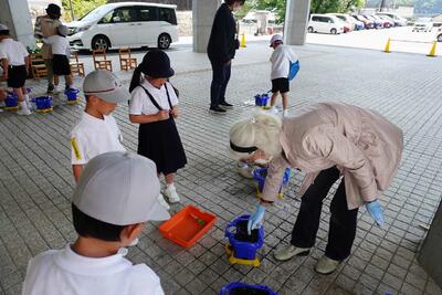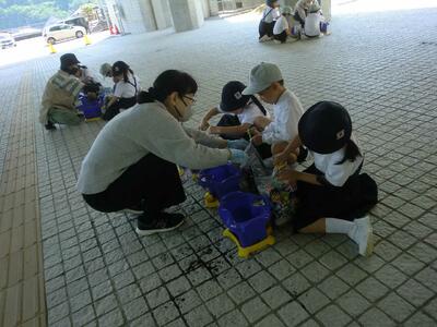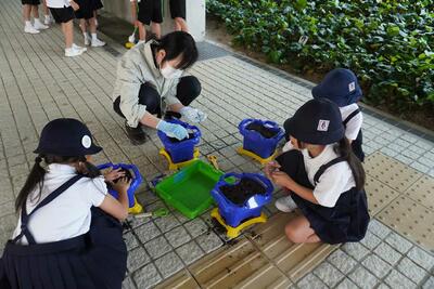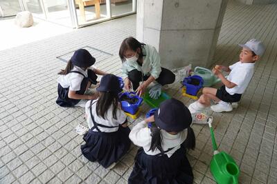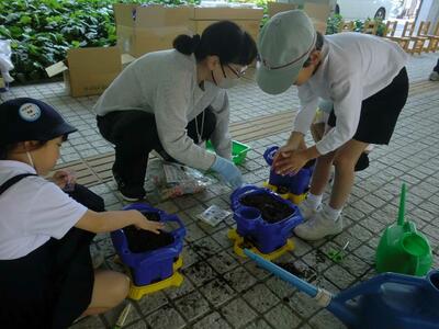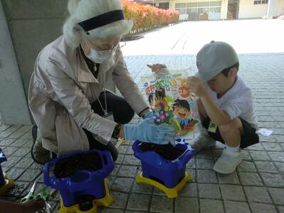 1年生がアサガオの種を植えました。この日は地域ボランティアさんに教えていただきながら、自分の鉢に種を植えていきました。