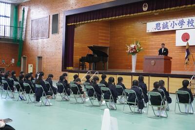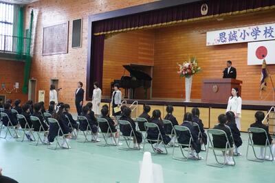 始業式の校長先生の話では、「「想像する力」を働かせて、望ましい言動、思いやりのある言動を増やしましょう。そして、笑顔あふれる元気な思誠小学校にしていきましょう。」という話がありました。