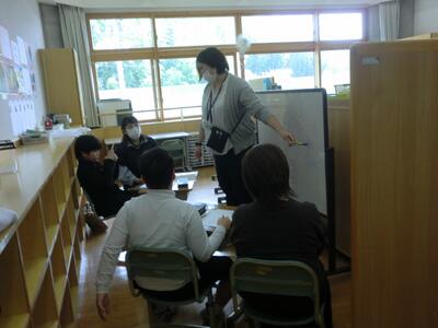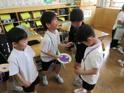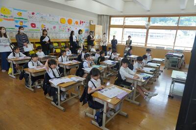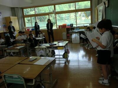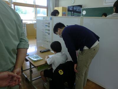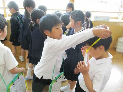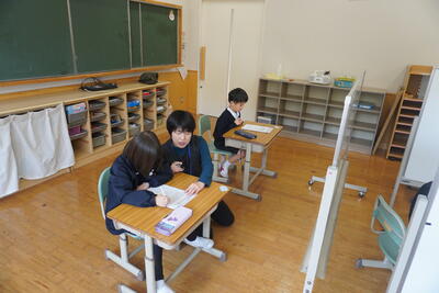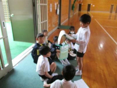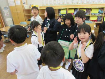 2年生が1年生を連れて学校探検をしました。お兄さん・お姉さんとして、学校の中を案内し、わかりやすく紹介していました。2年生の成長がとても感じられる時間でした。1年生も2年生の指示にしたがって上手に見学できました。1カ所めぐるたびにシールをもらって嬉しそうでした。