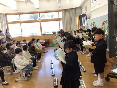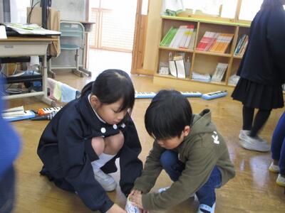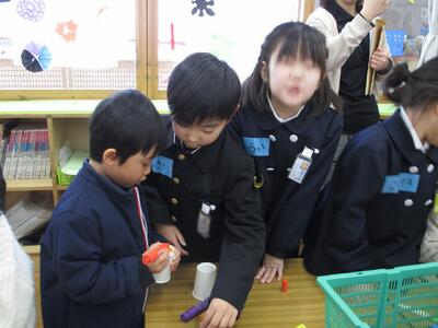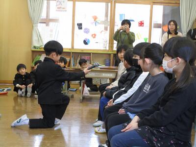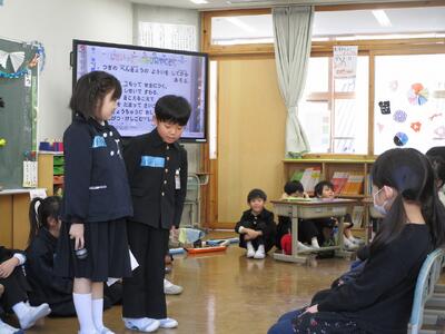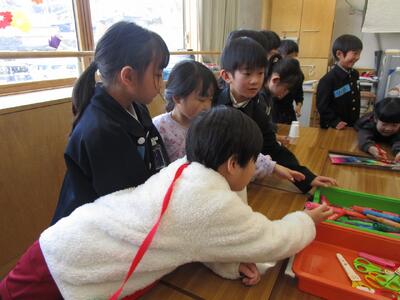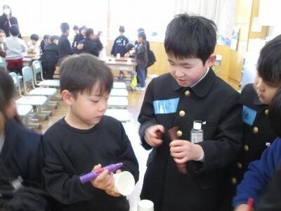 来年度の新1年生を招き、体験入学を実施しました。1年生が進行役となり、自己紹介をしてもらったり一緒に工作をしたりしました。また、体育館で一緒にゲームを楽しんだりしました。1年生がお兄さん、お姉さんとして頑張りました。